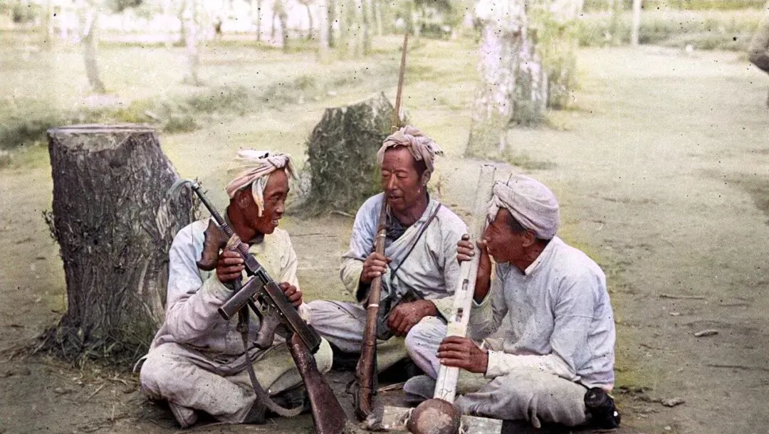 树墩当桌,土地当椅,三个人围坐嘀咕的多半是怎么守夜、哪片沟坎能埋雷,他们笑着,可眼底是累,照片没声音,我却仿佛听见风里簌簌的树叶声,和远处锅灶上“咕嘟”沸的粗茶汤。