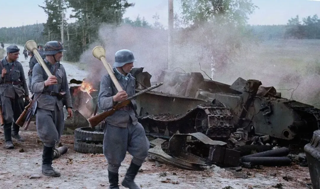 这几位肩上扛的家伙叫铁拳反坦克榴弹,圆圆的喷口像一只大汤勺,旁边那辆被烧塌的钢铁疙瘩是中弹后的T‑34,履带抽断像蛇皮一样散在地上,火苗从发动机舱口往外舔,几个人从残骸边走过,谁也没回头看一眼,战场上看多了也就这么麻木了。