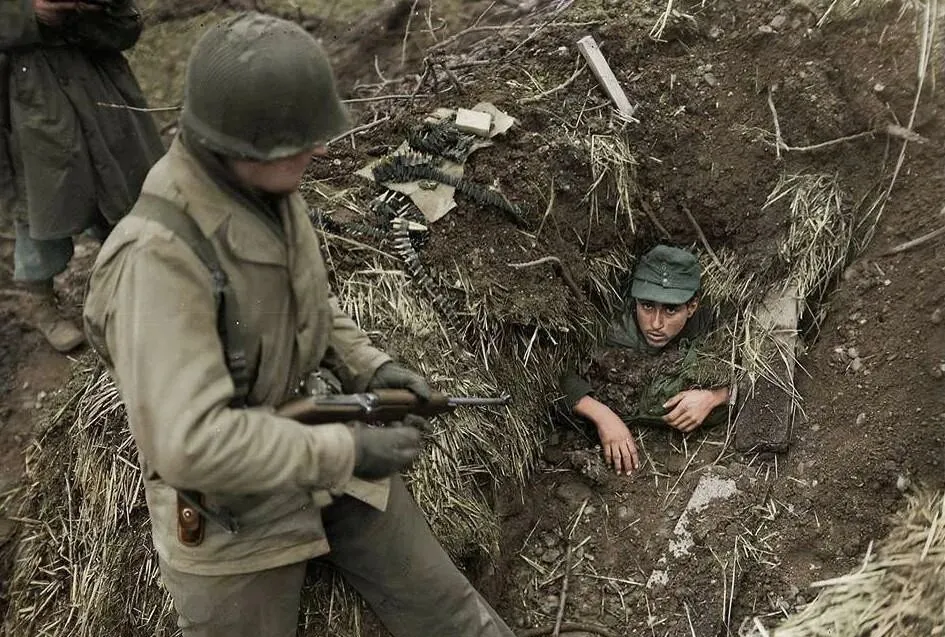 这个从地里钻出来的洞叫狐狸窝,士兵把身子蜷成一团埋在草垫底下,枪带还挂在肩上,人却已经没了主意,抬头看着上面那支冲锋枪,眼神里只剩下恐惧和求生,小时候我第一次见到这张图,心里直犯堵,明明是个大活人,怎么就像被世界整个吞进了土里。