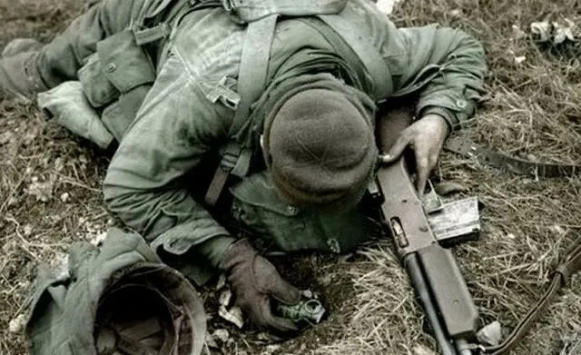 地上那人攥着的短木托是BAR自动步枪,另一只手里的圆疙瘩是MK2手雷,帽子滚出了一米多远,扣带还开着,草根被血糊住,照片不多语,一句话都没留给他,妈妈看完问我,战场上是不是来不及告别,我说怕是连名字都来不及被记住。