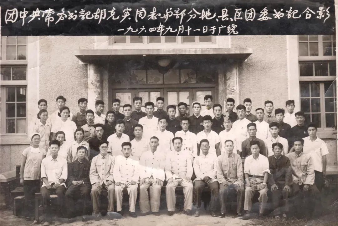 1964年9月11日,共青团中央常务书记胡克实与山东省部分地、县、区团委书记在广饶县合影。前排左六为胡克实;三排左七为共青团桓台县委办公室主任刘宗泽。(照片提供者:李秀福)