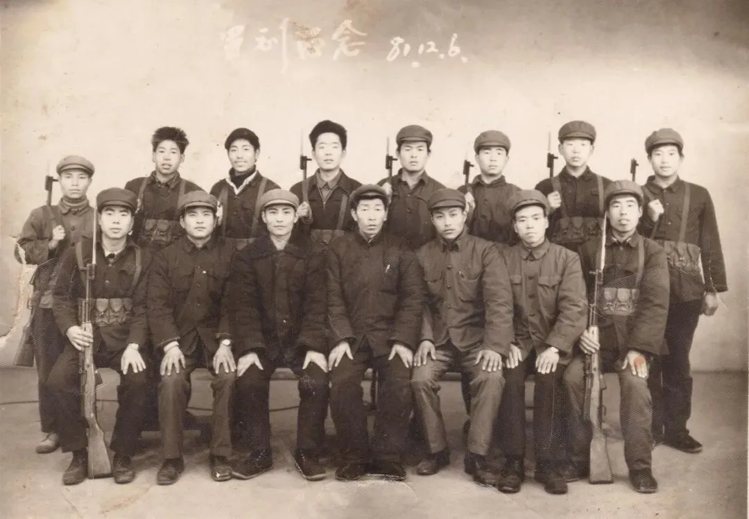 1981年12月6日,周家人民公社绍南大队民兵连军训结束后到桓城照相馆合影留念。时任绍南大队民兵连长李象英(前排左三)还邀请绍北大队民兵连长李传功(前排左四)参加了合影。(照片提供者:李象英)