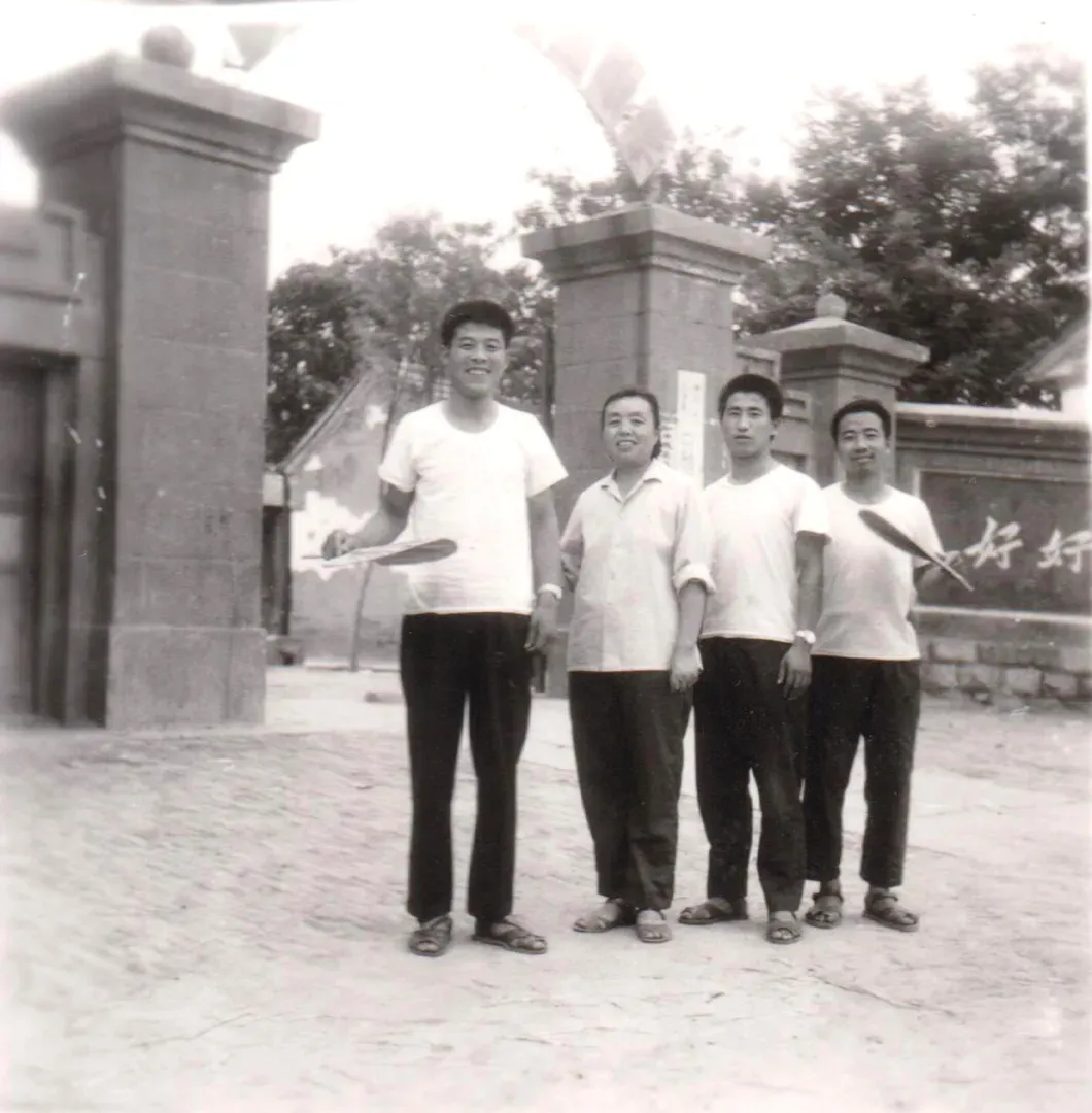 1972年5月4日,桓台二中(当时改名为桓城中学)团总支书记温桂琴(左二)与到学校视察工作的共青团桓台县委领导在学校门前合影。(照片提供者:温桂琴)
