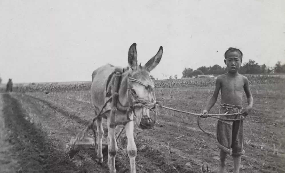 图中瘦瘦的孩子牵着一头驴,这个活儿叫赶犁,驴额前一溜皮绳,套胸带磨得发亮,铁犁在地里划出直线,泥浪翻起就像刀背,男孩赤脚踏在潮土上,脚腕子用草绳缠着免得刮破皮,奶奶说那会儿家里孩子小也得上地,收成全看这几道沟穿得齐不齐。