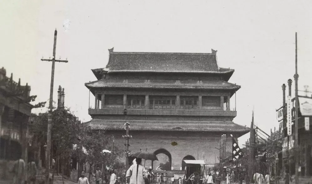 这个高大的楼就是北京鼓楼,正脊压着兽吻,檐角挑出去很远,楼下街口竖着木电线杆,几根线拉得笔直,可能是电灯也可能是电报,风一吹哗啦作响,楼前人来人往,有人打伞有人抬担,远处车把手晃来晃去,城北的脊梁就这么立着。