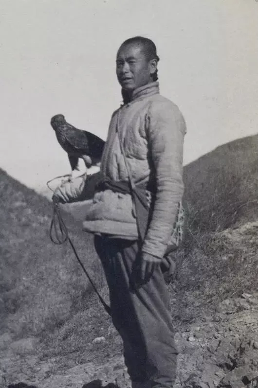 这位手臂上站着的家伙叫鹰,臂上绑着皮护腕,细绳缠住鹰爪,鹰头小毡帽扣着,眼神冷得像刀背,这位主人站在坡地上,衣襟迎风,嘴角压着笑,等一声口哨,鹰就腾空划个弧儿,小时候在胡同里常见人提着鸟笼,真见鹰玩儿还是头一回。