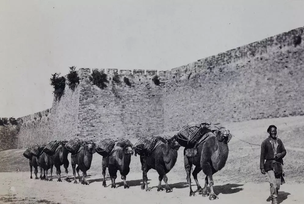 沿着城墙走的这一串叫驼队,双峰驼背上架着柳条筐,筐里盖毡片,铃铛在脖颈下,叮叮当当一路,前驼鼻上穿绳,后驼接着尾,领队的人手里攥着缰,鞋面上全是土,爸爸说进京多是煤炭与皮毛,出京常见盐布和药材。