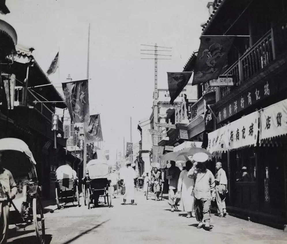 街头飘着的是黄龙旗,黄底蓝龙戏珠,旗角在阳光里发白,楼上的雕栏挂满布幅,栏杆外伸着杆子,旗面一溜排开,路上人撑伞抿着步子,车夫弓着背追着客,时代要转弯了,可旗还是照挂,买卖照做,谁也不肯把日子弄丢。