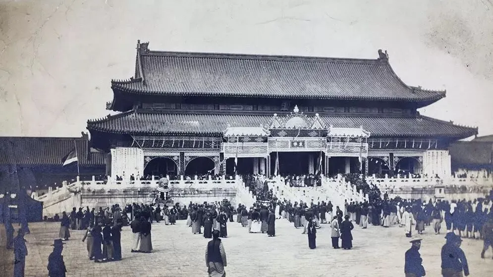 这处人潮汹涌的地方是太和殿前,台阶铺得宽,檐下金龙彩画还亮着,台口搭着棚,黑纱白幡一层层垂下来,官兵排列成队,外使也束着怀,众人跟随铜锣节奏缓缓进退,一场国丧把旧礼数尽数摆开,照片里静却能听见庄严的鼓点。