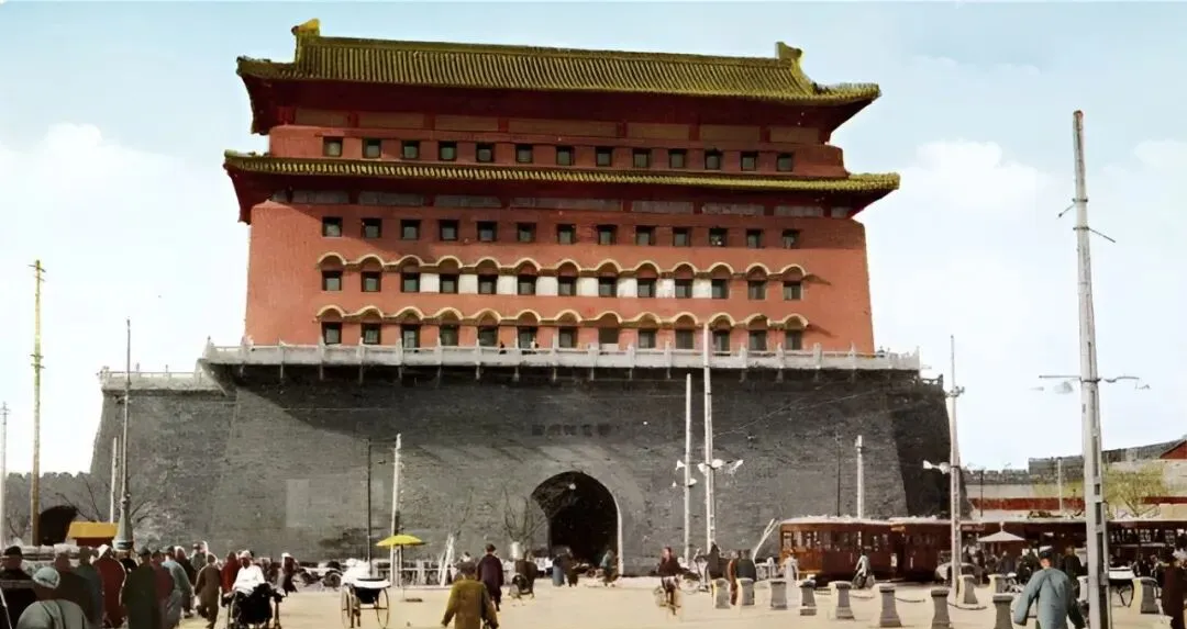 图中这座红墙灰基的楼叫正阳门箭楼,砖砌高台上托着重檐黄瓦,眼洞一样的小窗一排排看得人发怵,楼下电车在轨道上慢慢蹭,挑担的、拉车的从拱洞里穿来穿去,奶奶说那时出趟前门,得先抬头认这楼,才算进了北京的正经门面。