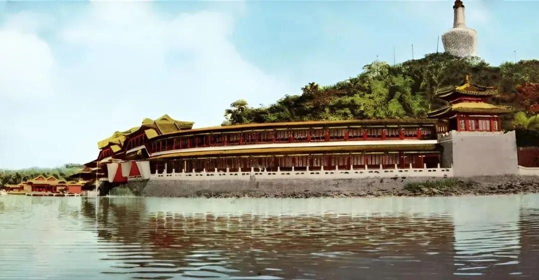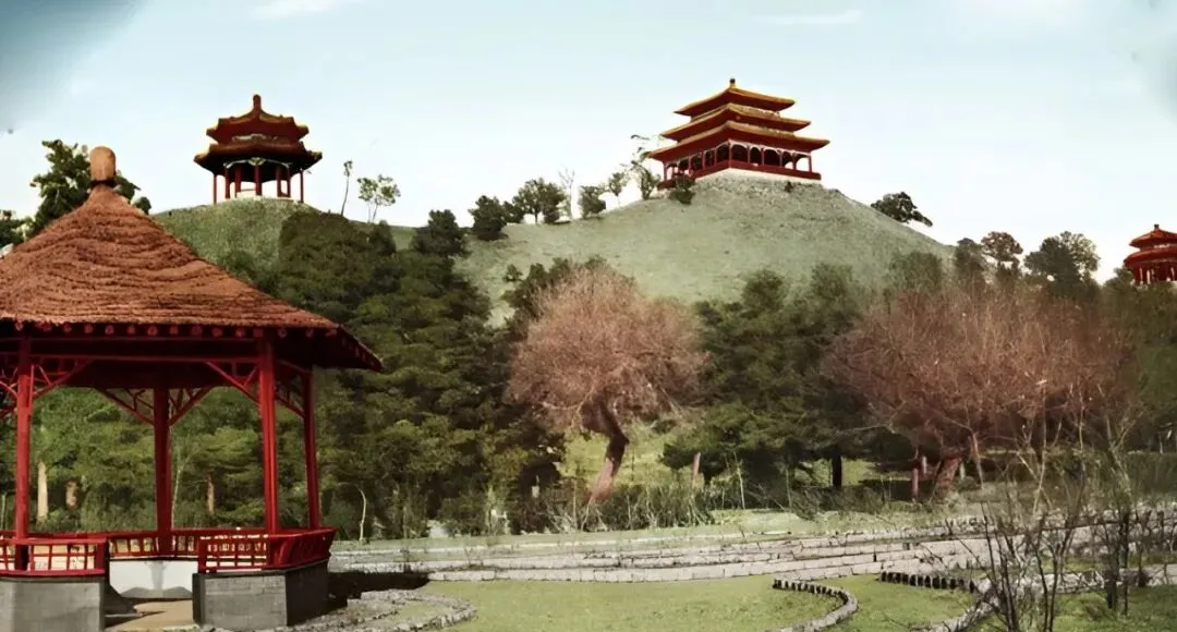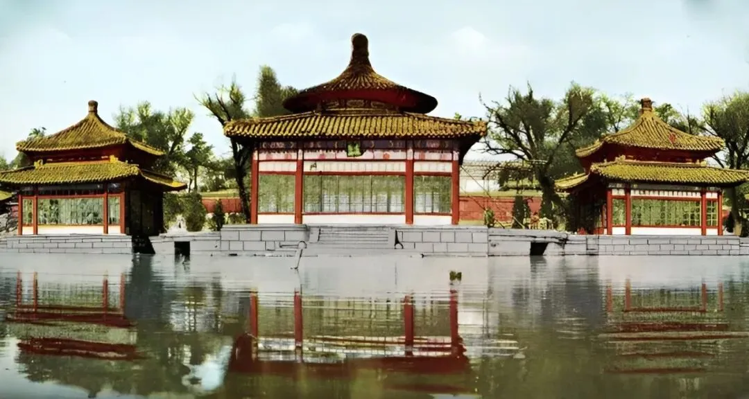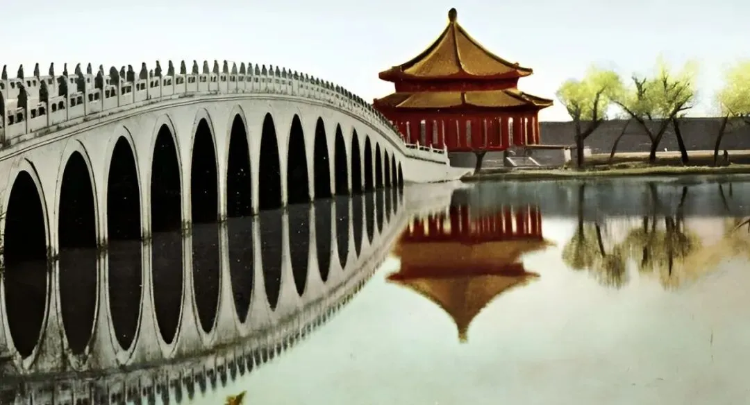 这几座亭子一字儿排在水边,石台、红柱、黄瓦,倒影把亭子又画了一遍,老照片里连树影都不着急,安安稳稳的。