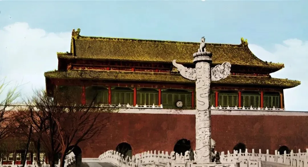 这个大门叫端门,站在天安门城楼南边的老邻居,红墙白栏,华表立在一侧,妈妈说过去进宫门一层一层,端门、天安门、午门,走错了都不成。