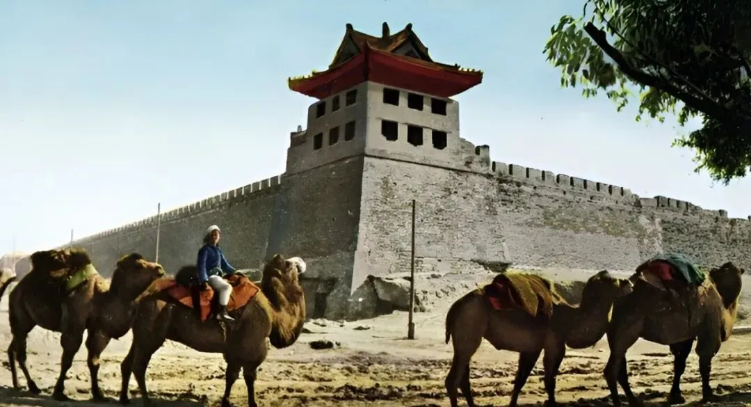 这串儿家伙是骆驼队,城角楼下慢吞吞走,驼铃声叮当,尘土被蹄子踢起来,照片里的人裹着青布袄,眯着眼看太阳,那会儿北方靠它们拉盐拉粮。