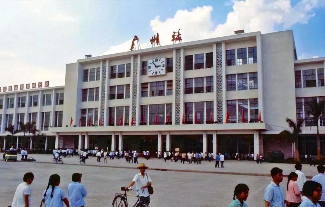 图中这座方正的白色大楼叫广州火车站,正中一只大钟挂得端端正正,屋顶还有雕塑,远看挺威风,站前广场空阔得很,行李卷儿一放地上,人就跟着广播跑,当时不少人的广州梦,就从这口钟敲出的时间里出发。