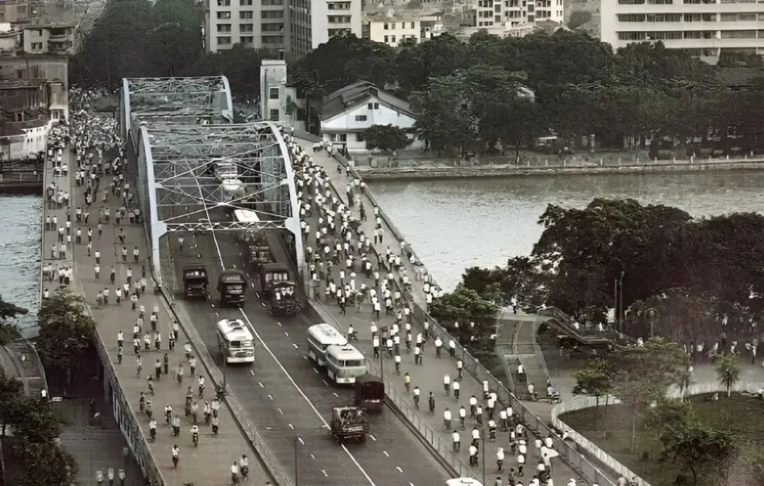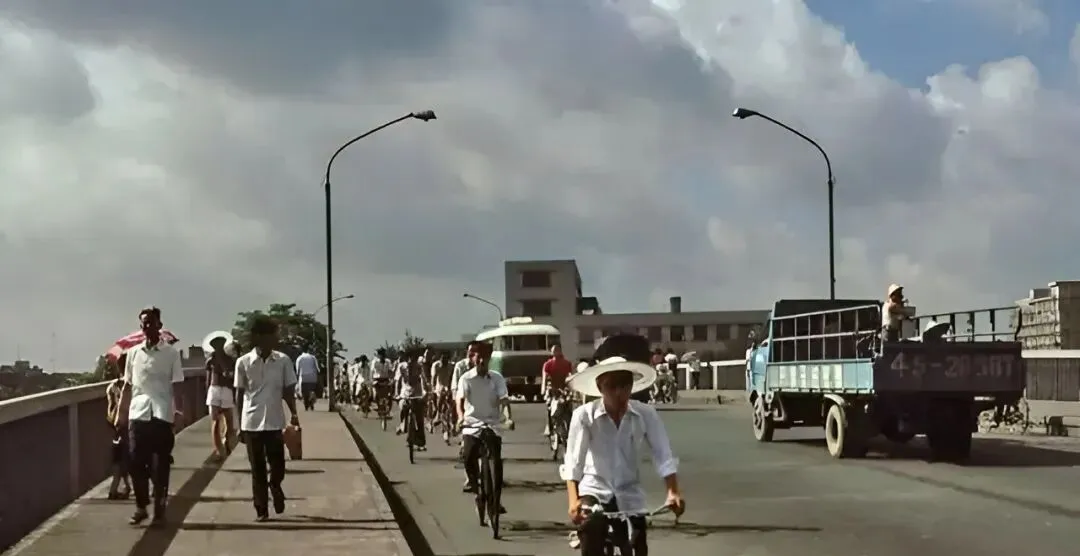 这个钢架子桥叫海珠桥,桥面分成车道和非机动车道,左右两边的自行车密密麻麻,像蚂蚁搬家一样,妈妈说那时候上班靠两条腿和两只轮子,过桥要会见缝插针,慢半拍就被人流冲散了。