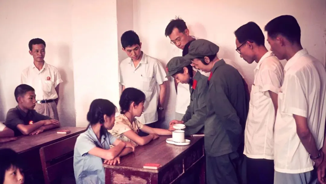 图里穿军绿色的是卫生员,胳膊露出来,棉球在小搪瓷碗里泡着,酒精味冲得人直眯眼,老师站一旁看着,谁胆子小就先把袖子卷好装镇定,其实手心里全是汗。