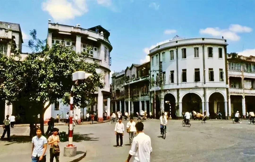 图中这个路口叫老骑楼街,圆弧形的转角带着廊柱,阴影底下凉丝丝的,自行车叮当叮当,抬头一看天空蓝得发亮,转角处的小卖部常摆甘蔗和汽水,一角钱能买个好心情。