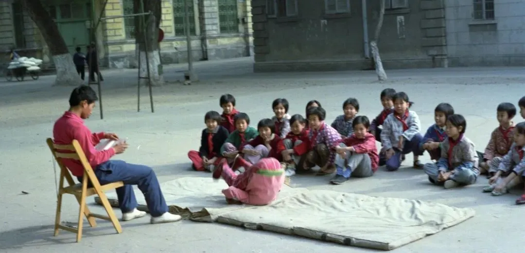图中这个办法叫板凳围栏,哥哥把凳子和椅子扣成一圈,小弟被“圈养”在中间,脑袋一歪就想往外钻,哥哥叉着腰当巡逻,家里大人去忙活,巷口的风把衣角吹得鼓鼓的。