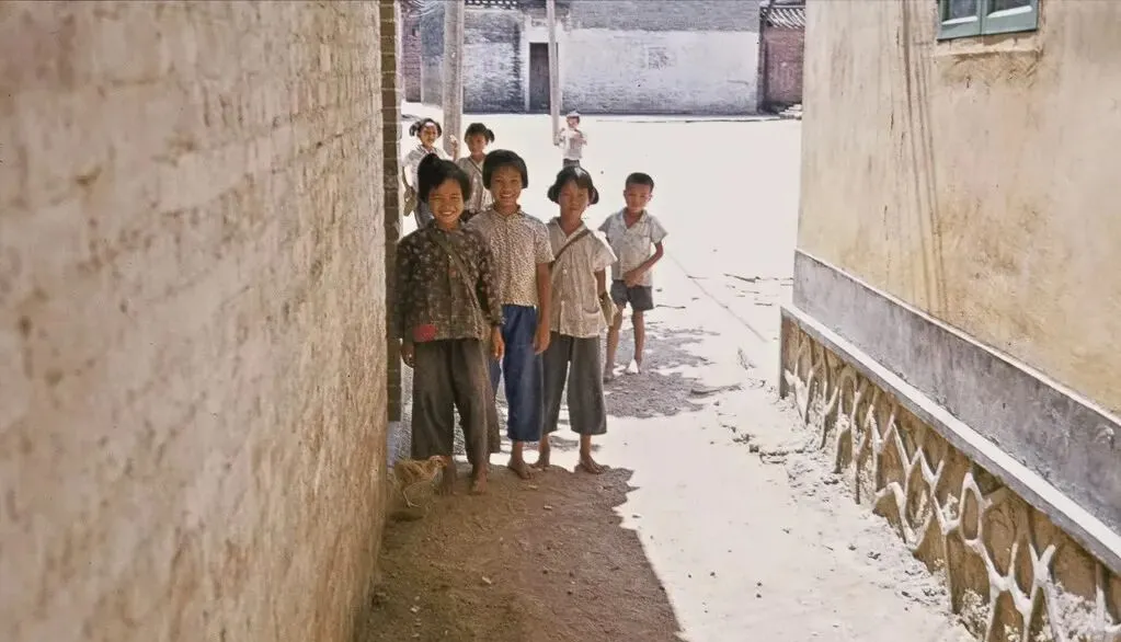 这是老墙和新墙之间的狭长巷道,一头亮一头暗,几个赤脚孩子笑得露出白牙,手里拎着自制的弹弓,猫在阴影里看人,阳光在地上铺了一条能追着跑的路。