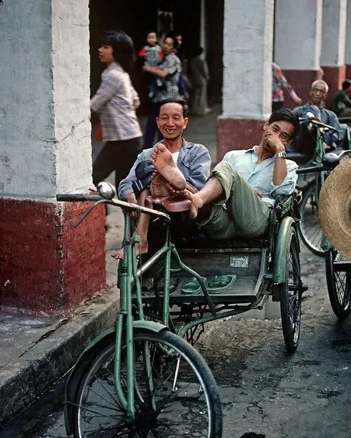 这个三轮子叫人力车,车夫靠着坐,脚丫子搭在横梁上,笑得爽利,旁边同伴眯着眼抽空打个盹,铃一响就立马起身,老城的买卖就靠这份灵气。