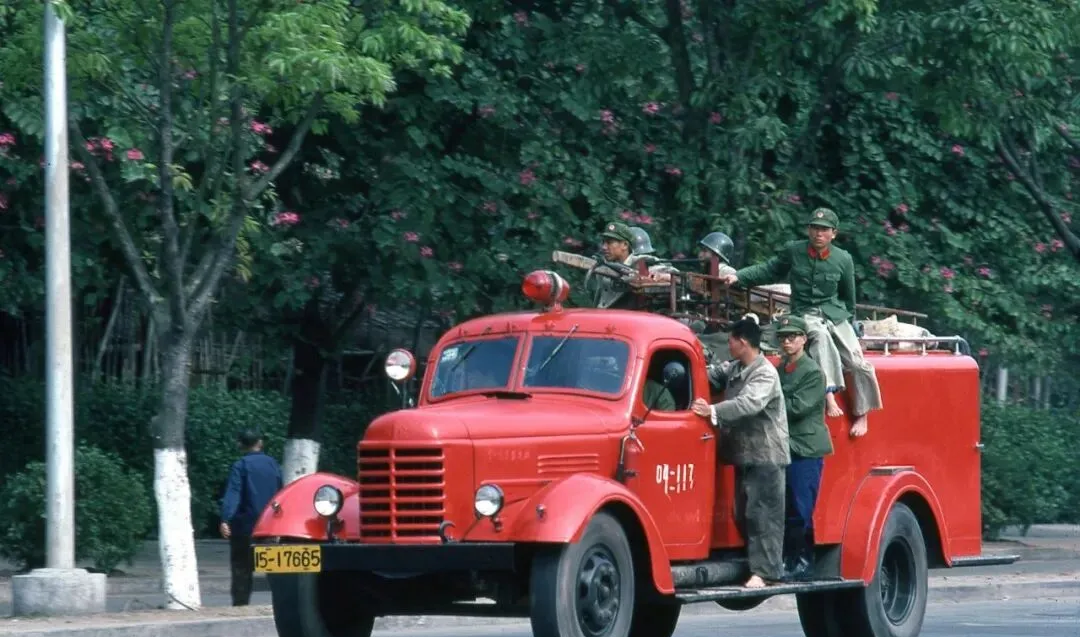 这台红家伙就是消防车,圆灯泡凸在前盖上,战士抓着扶手坐两边,头盔卡得紧,车身一颠一颠,警铃一拉开道迅速,转眼就不见了影。