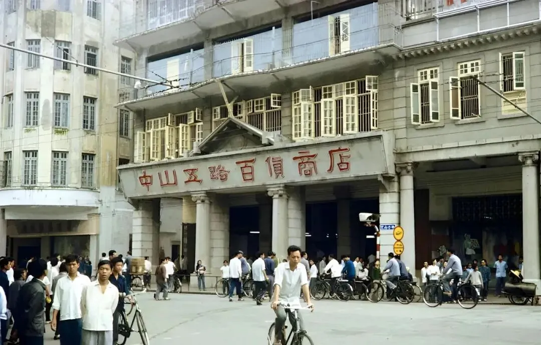 这个门脸上写着中山五路百货商店,石柱粗壮,招牌字是立体的,门洞里人头攒动,推着自行车进去得小心翼翼,妈妈说那会儿买个搪瓷缸能用好多年,现在逛商场,一转身样式就换了。