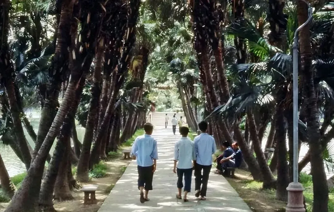 这条路两边都是高高的棕榈,影子在地上打成一片斑驳,湖面透亮,穿着蓝布衫的年轻人并排走,脚管挽到小腿肚,边走边聊,风一来烦恼就往后退。