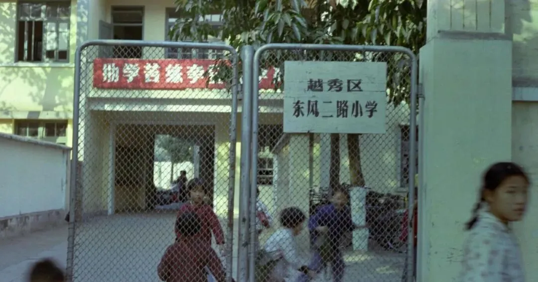这个铁栅门写着越秀区东风二路小学,红色横幅挂在门廊上,孩子们提着书包往外冲,门卫叔叔伸手拦两下才缓过劲,七八十年代的牌子字体一看就熟。