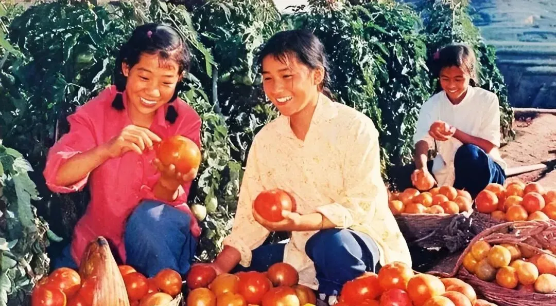 这个红彤彤的叫老品种番茄,皮薄汁多,抓在手里沉甸甸的,姑娘们边摘边抹一把汗,篮子一会儿就满了,家里做面条时,锅里一捣就出沙,酸甜劲儿到现在都记得。