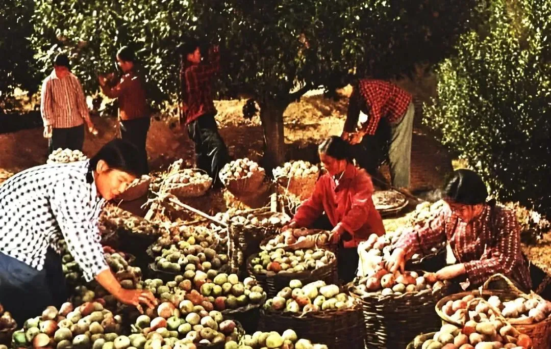 图中柳条编的大筐叫摘果筐,口沿粗厚不磨手,装满了圆滚滚的苹果,挑在扁担两头稳稳当当,地头上有人分拣有人记号,陈永贵在树下捧着果子说今年皮色正,大家笑得见牙不见眼,这种热闹味儿,现在超市里可找不着。
