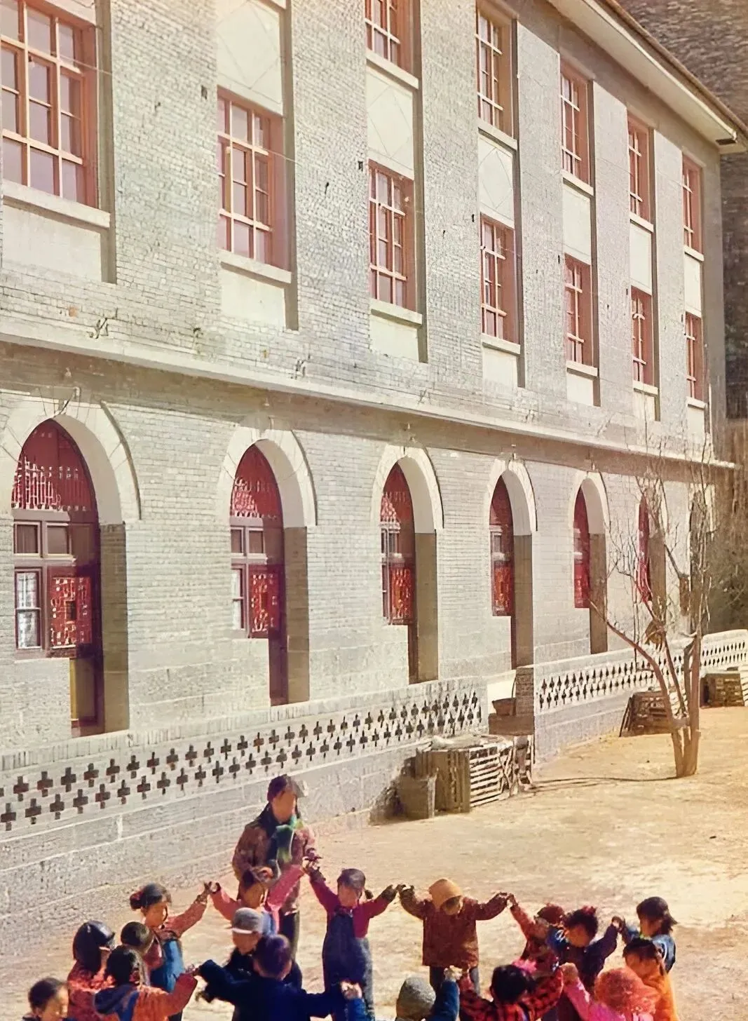 这几张里的青砖就是自家窑里烧的,砖坯一摞摞晒在院边,房子盖起两层带拱窗,红漆窗棂在阳光里亮堂堂,老师领着孩子在院里转圈做游戏,妈妈说那会儿住上新房,第一晚都不舍得躺床沿,怕把新被面弄脏了。