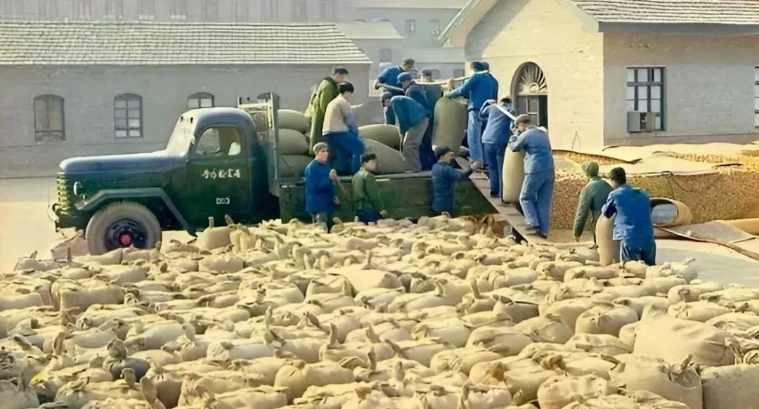 粗麻布袋口一拧一系,码在解放牌车斗里,地上摊着像小山,孩子们在边上帮着递袋子,司机按两下喇叭就出发了,现在仓储有叉车有托盘,那时全凭肩膀硬,队里人心往一处使,活儿也就不费劲了。