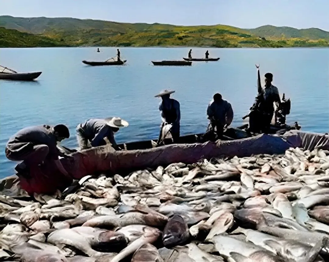 这几只小船拼成一字,网一收白花花都是鱼,船头人举手打招呼,岸边人已经抄好筐子等,水库既浇地又养鱼,一水两用,放到今天也叫精打细算。
