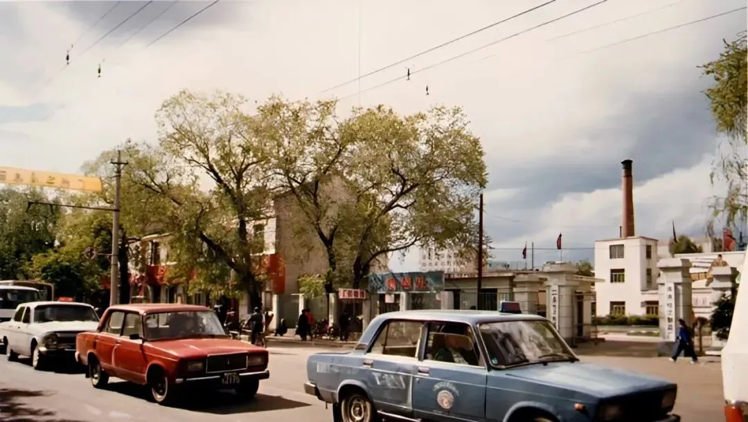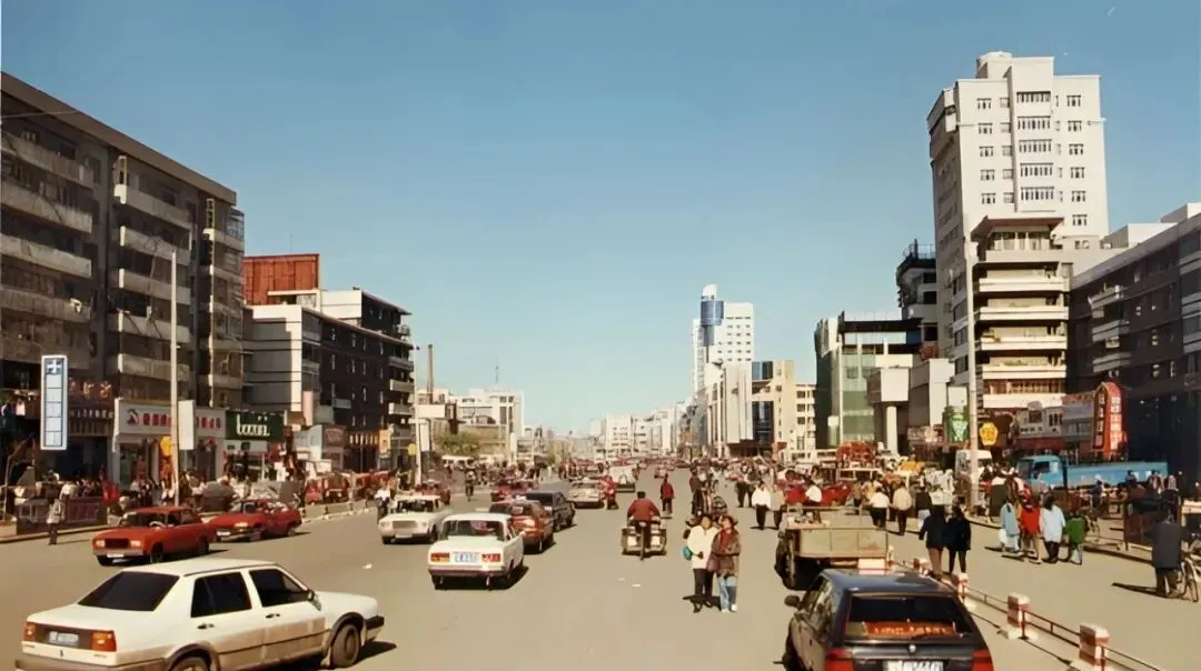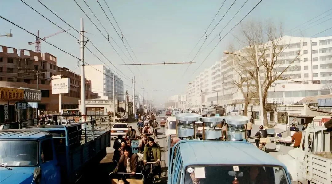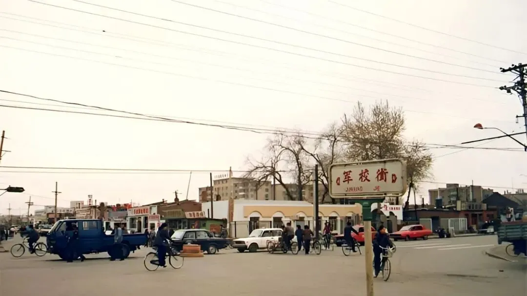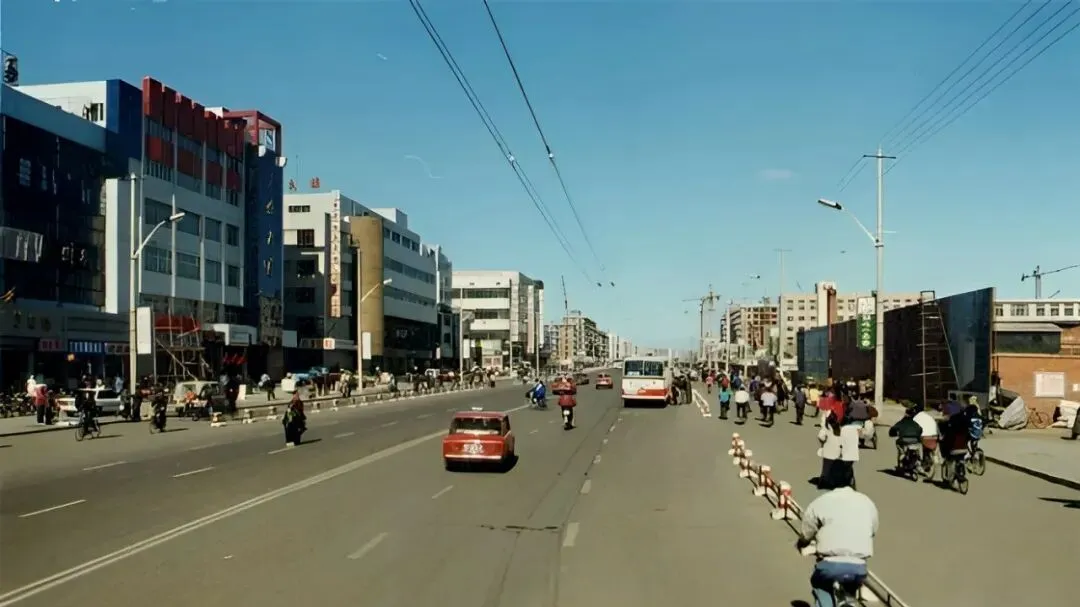 图中这条宽阔笔直的主干道叫卜奎大街,双向六车道,中间隔离桩一串一串排着,老捷达、红色拉达挤在一起,后斗三轮慢悠悠晃过,远处那栋蓝顶圆柱的大楼,是当年让人抬头看的地标,风一吹,尘土带着烤串味儿往脸上扑,热闹是肉眼可见的热闹。