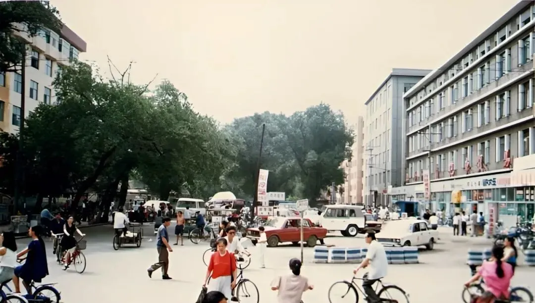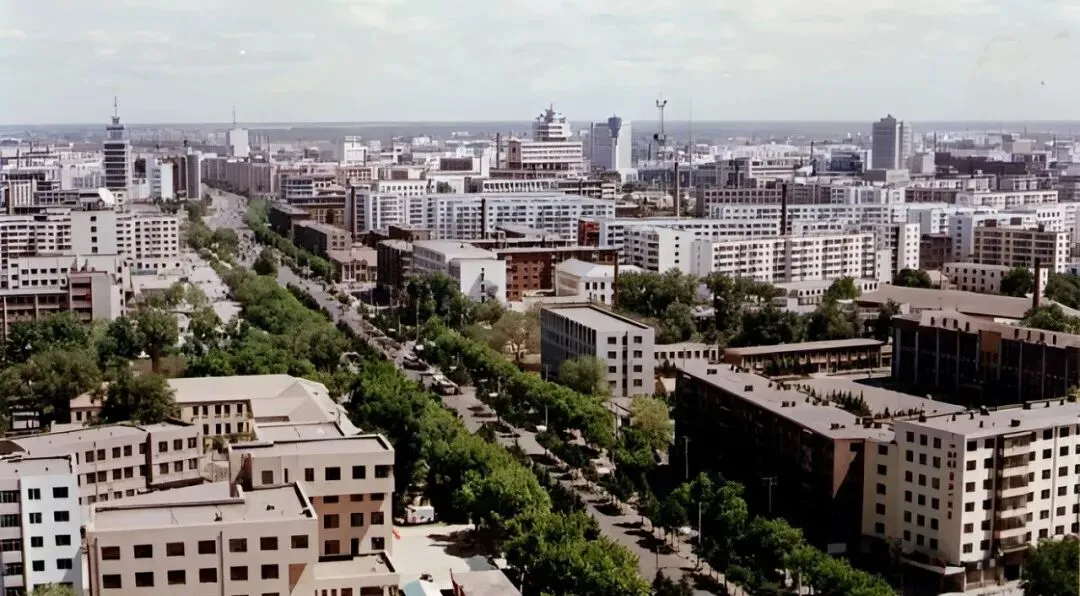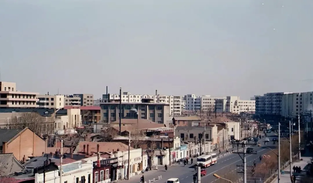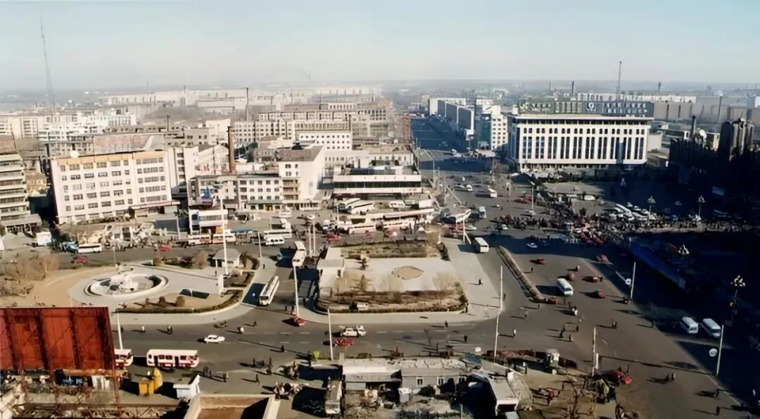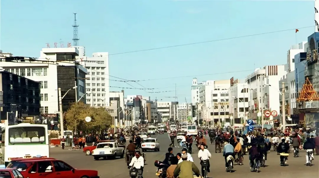 图中这条宽阔笔直的主干道叫卜奎大街,双向六车道,中间隔离桩一串一串排着,老捷达、红色拉达挤在一起,后斗三轮慢悠悠晃过,远处那栋蓝顶圆柱的大楼,是当年让人抬头看的地标,风一吹,尘土带着烤串味儿往脸上扑,热闹是肉眼可见的热闹。