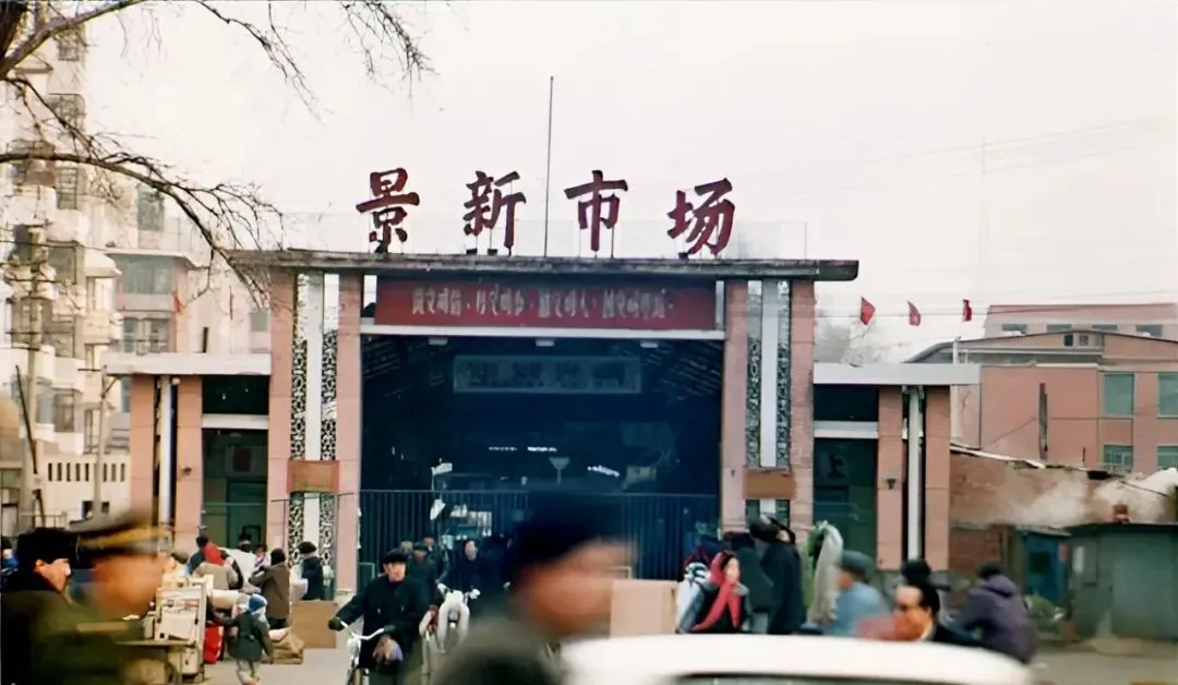 这个红字大匾叫景新市场,水泥方柱子上贴着蓝底花砖,门里灯光昏黄,里头卖家具的摊多,桌椅板凳把过道卡得只剩一人宽,爷爷说当年往里抬了一张旧三斗柜,磨一磨上点蜡,立马精神了,现在这片已经翻成景新大街了。