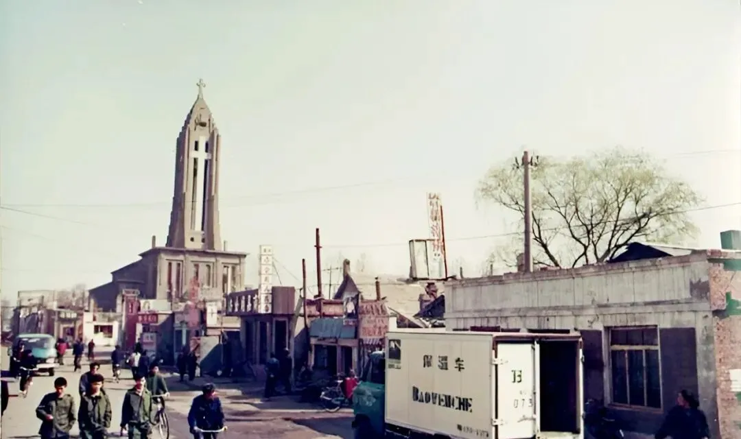 那栋尖顶高高的,是老教堂,后来归马戏团用,墙体灰青色,边上小店门脸嵌着绿色玻璃,路过时常能看到货车卸箱,白字蓝底的“保温车”三个字晃眼,若隐若现都是时代的影子。