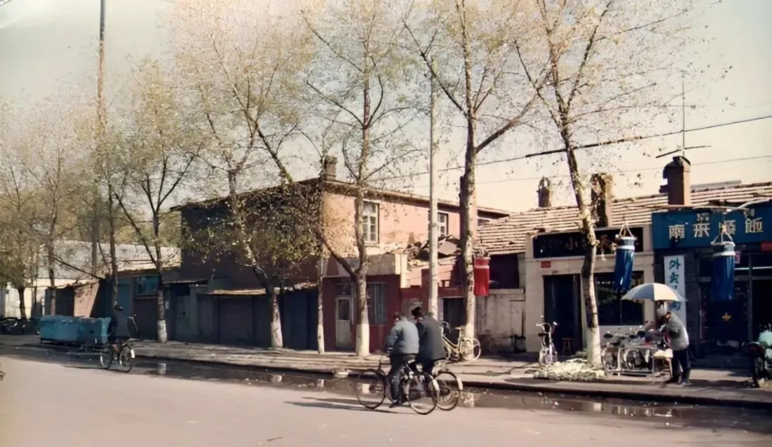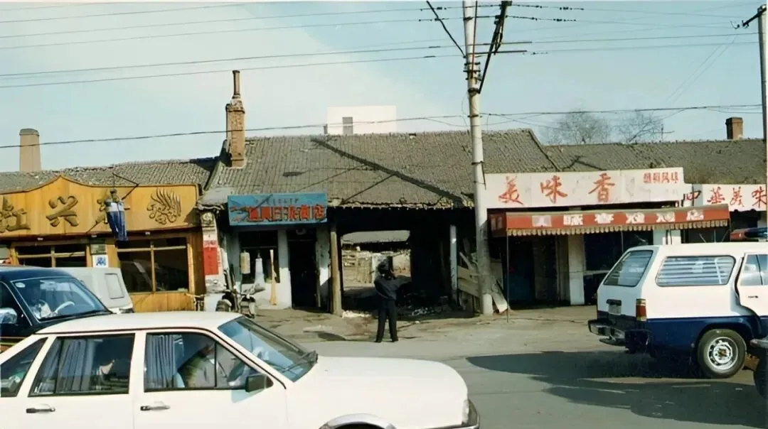 图中拐角那排黑底白字的招牌,是九十年代常见的饭店立面,门口一片车把手闪着光,进门就闻见锅包肉和大酱的香,服务员穿卡其色围裙,手里端着冒泡的铁锅炖,结账还要排队,热乎劲儿就从门口挤出来。