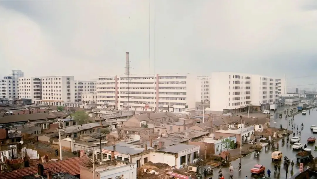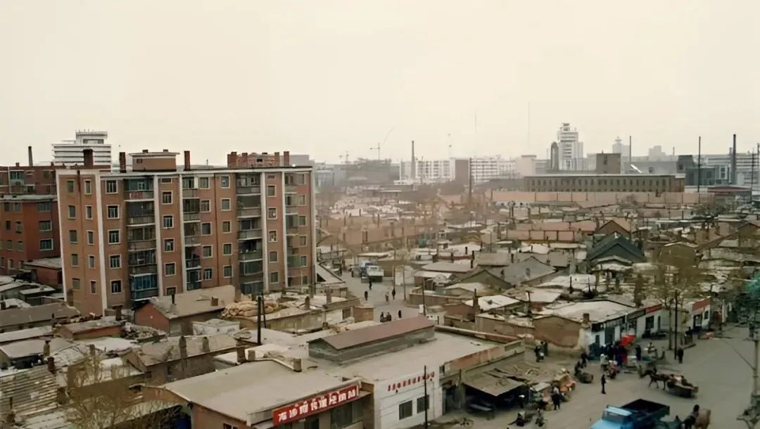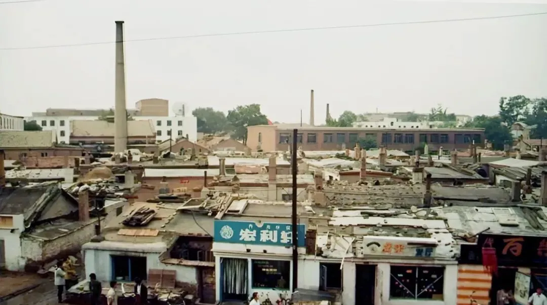 这张老得耐看,灰瓦屋脊上压着木板和石块儿,远处细长的烟囱把天空扎了个洞,街边药店招牌蓝得很正,门口站着等人的大叔,手里拎着搪瓷缸,生活气一股脑扑面来。
