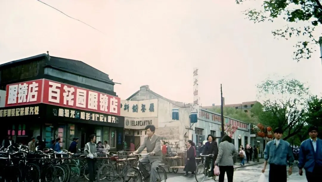 左边大红招牌写着“眼镜店”,右边是“新桥茶座”,玻璃门上贴着“测光度”,青色自行车排成长龙,店里广播喊名字取镜片,奶奶乐呵呵地说,换副新镜儿,看戏才不费劲。