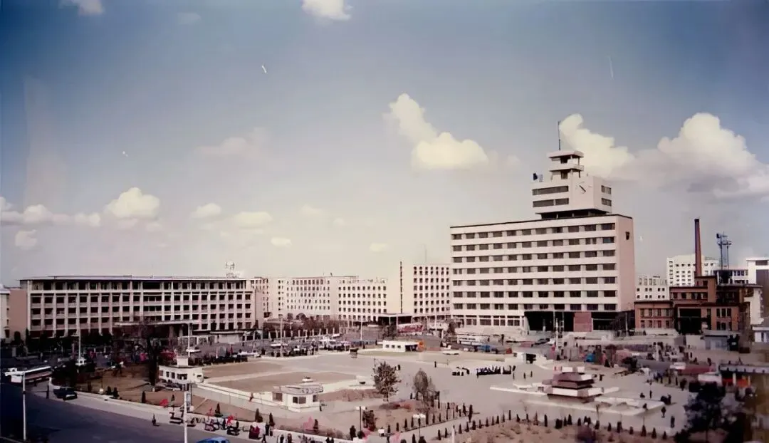 这张从高处拍下来的广角照,能看到四面八方的道路都向中心汇过去,环岛里树还小,公交车一辆接一辆绕着走,白顶大楼在阳光下亮得扎眼,城市当年就这股子扩张的劲儿。