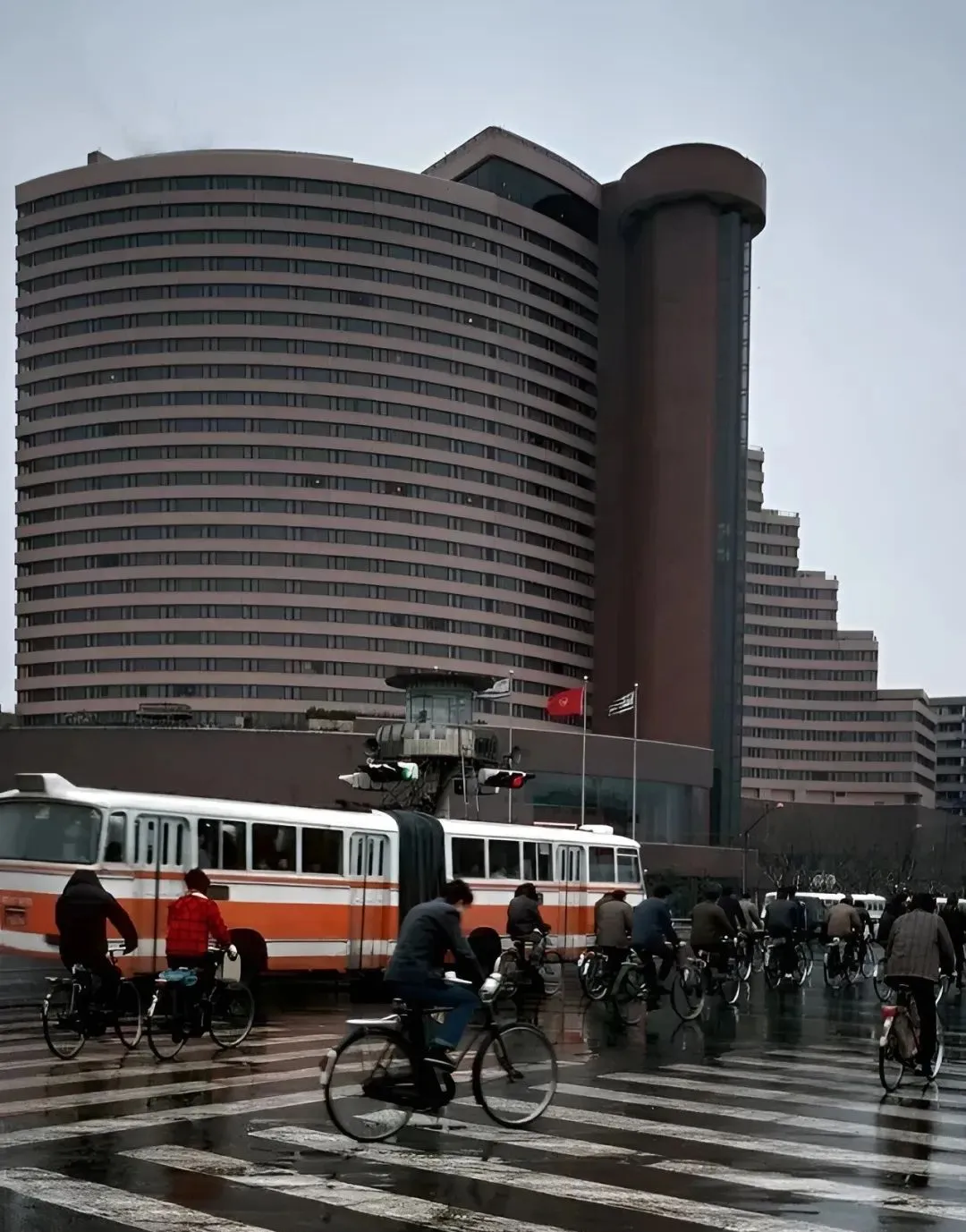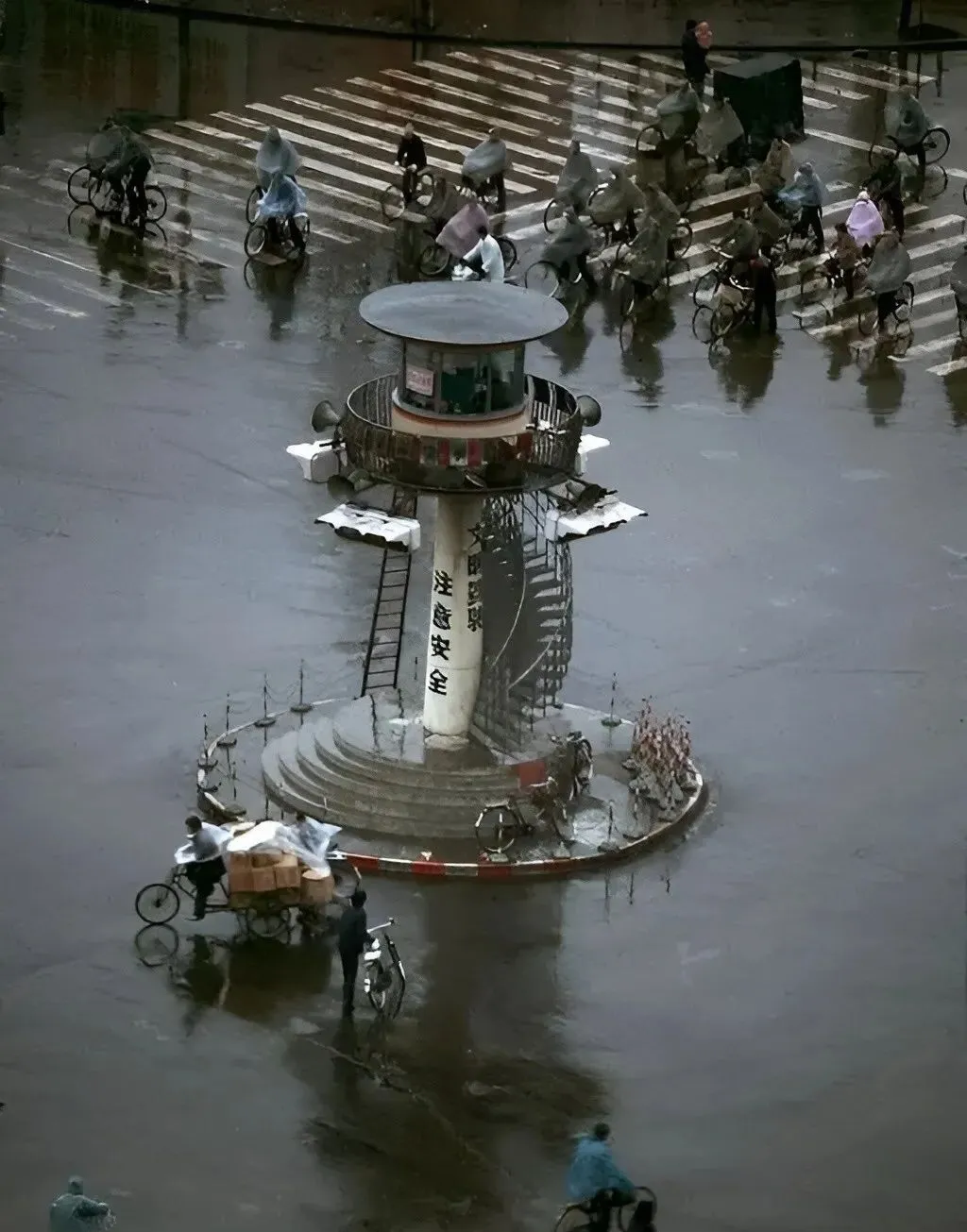 这个圆圆的家伙是交通岗亭,立在路口正中央,螺旋梯盘上去,警察叔叔站里头抬手一挥,四面八方的自行车就像水流一样分开,雨天岗位边上要垫纸箱,省得鞋被水泡透。