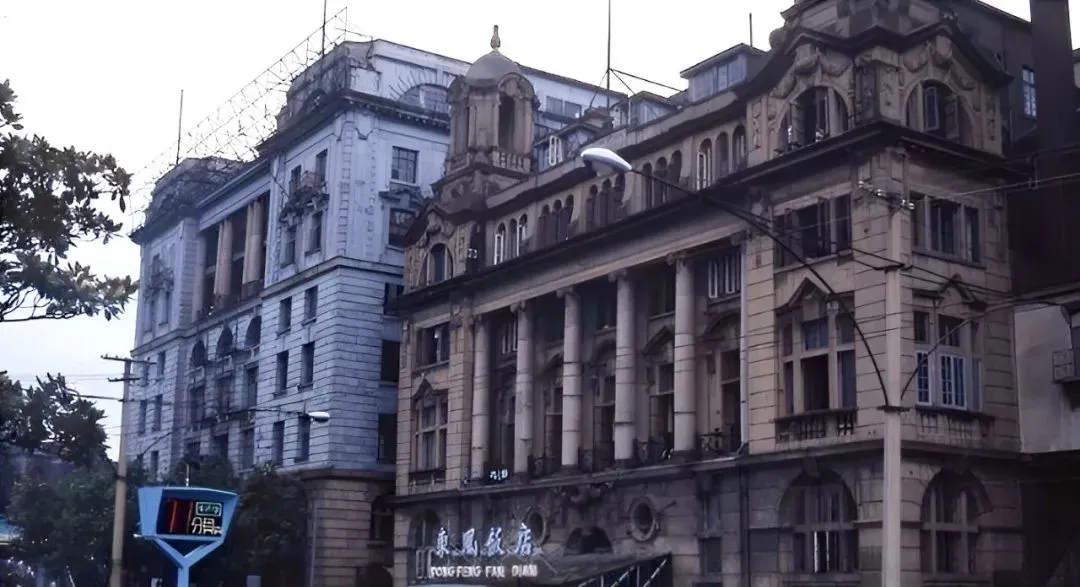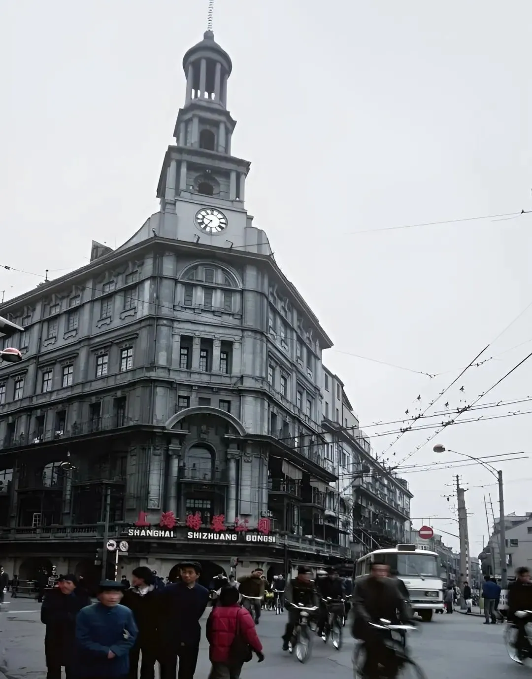 这栋灰色钟楼边的楼叫上海时装公司,立柱粗得能抱不过来,底下橱窗摆着模特,风一过店招的霓虹会轻轻抖几下,那会儿最潮的夹克就在这儿,表哥拿到工资第一件事就是来这里淘一件。