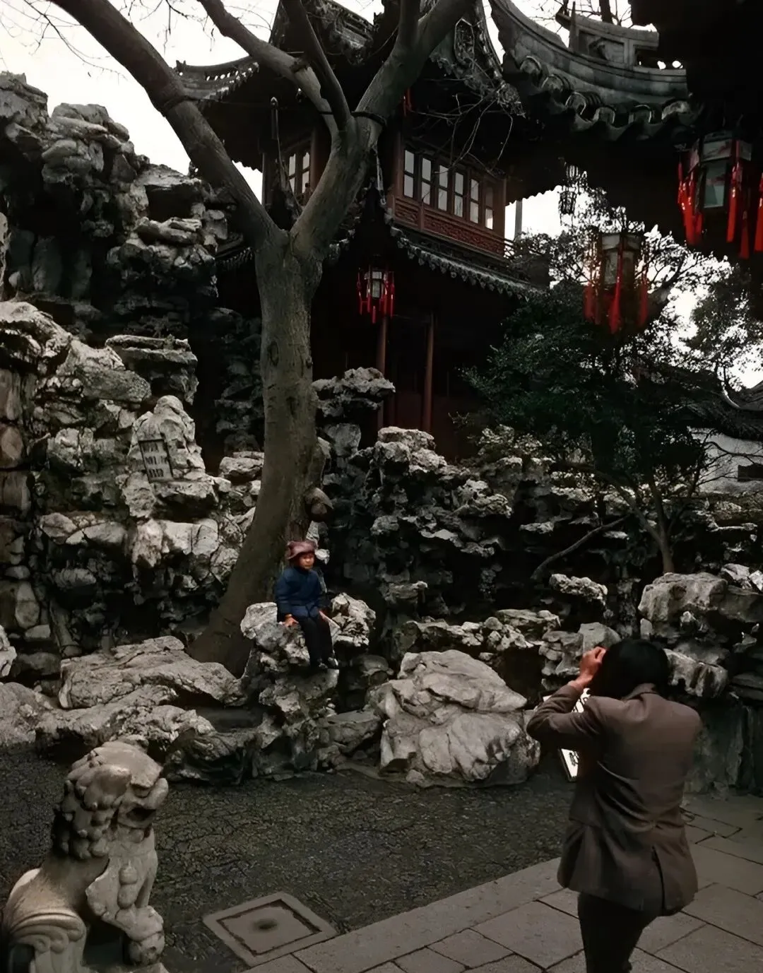 这个角落在豫园,假山石堆得陡,石缝里冒出青苔,小朋友坐在岩石上笑,摄影师半蹲着托相机,咔嚓一下,旁边的红灯笼在风里轻轻摆,我小时候来这儿也爱往石头上爬,裤腿一抬都是灰。