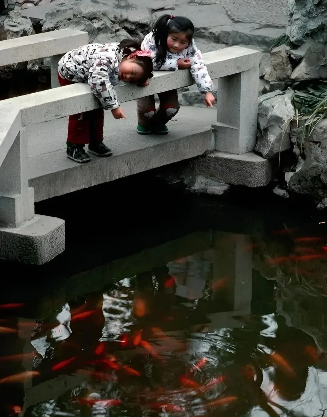 这座水泥栏杆的小桥就是九曲桥的一段,两个小姑娘趴在上头指水里,锦鲤一拱一拱把水面拢成花,旁边的大人递来馒头屑,鱼群一下就炸开了,笑声顺着水面跑远了。