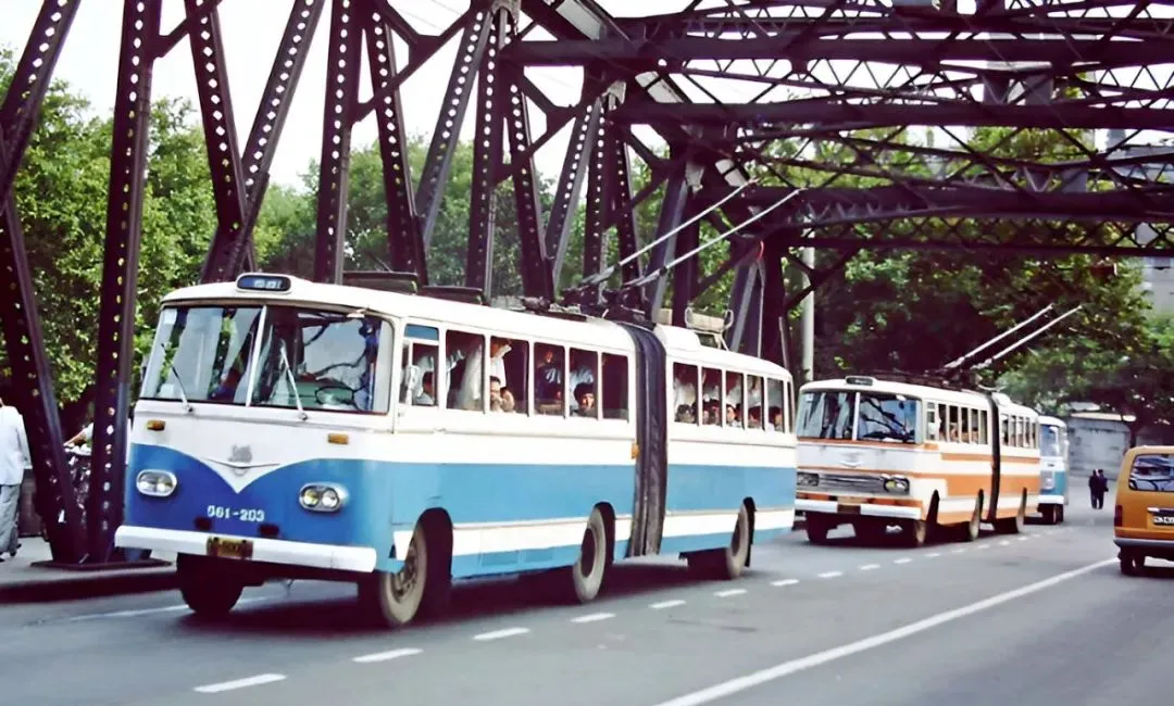 图中这座铁骨架桥叫外白渡桥,黑灰色的钢梁一格一格排着队,最惹眼的是电车车顶那两根大辫子,啪的一声搭上空中的线,车厢里人挤人,窗边还探出小孩的脑袋,司机踩着油门不紧不慢过桥,桥下风一吹就是黄浦江的腥咸味儿。