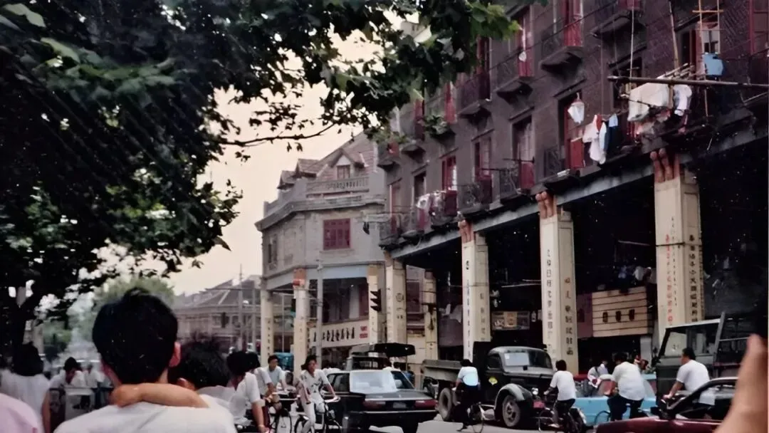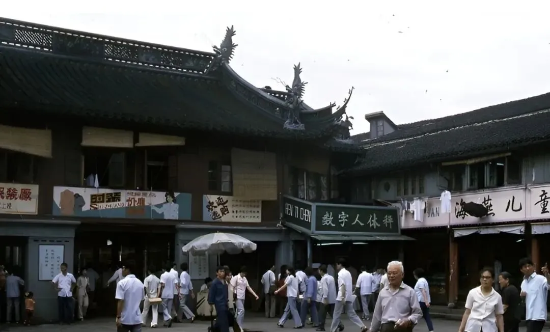 这面飞檐底下是豫园商场,招牌挨着招牌,修衣机缝的招幌子写得密密麻麻,午后人挤得肩碰肩,竹帘子半卷着,风从弄堂口钻进来,把汗味和香味搅在一块儿,那时买衣服讲究能改能修,穿得久才划算。