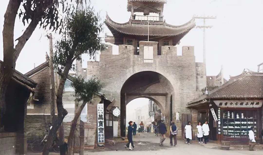 图中这座门楼叫东城门,砖砌城台厚实,券洞高挑,城楼三层翘檐,正中立着细长旗杆,屋脊边角挑起的兽头在风里像要飞起来,城门两侧柜台林立,药铺招牌黑底白字很醒目,白褂伙计靠门而立,门洞里有人推车有人牵着孩子,热闹得很。