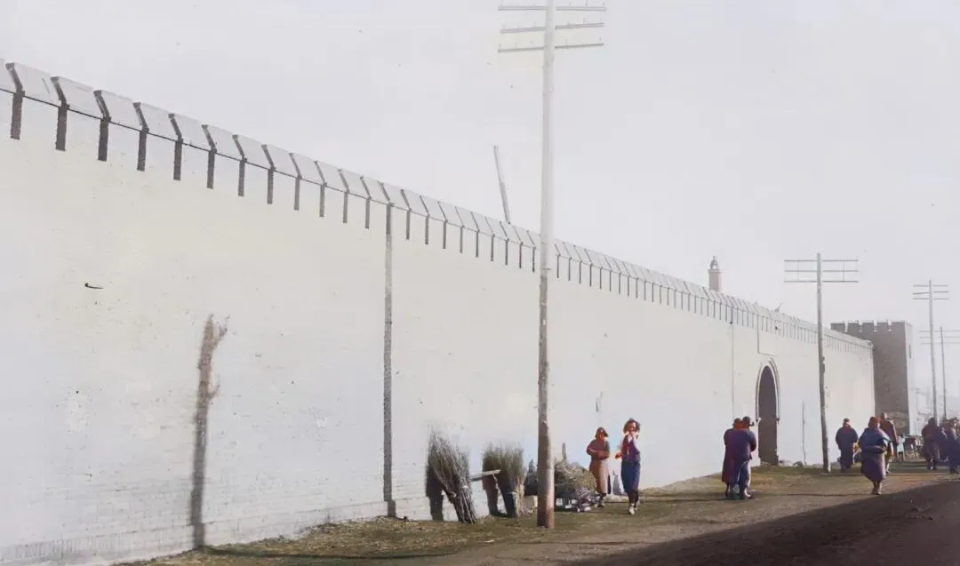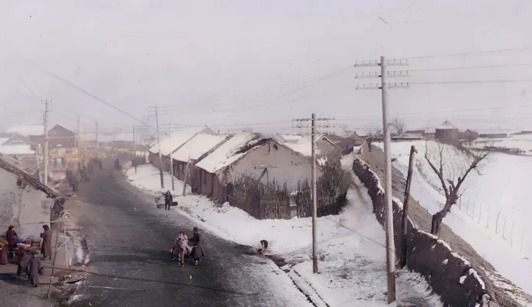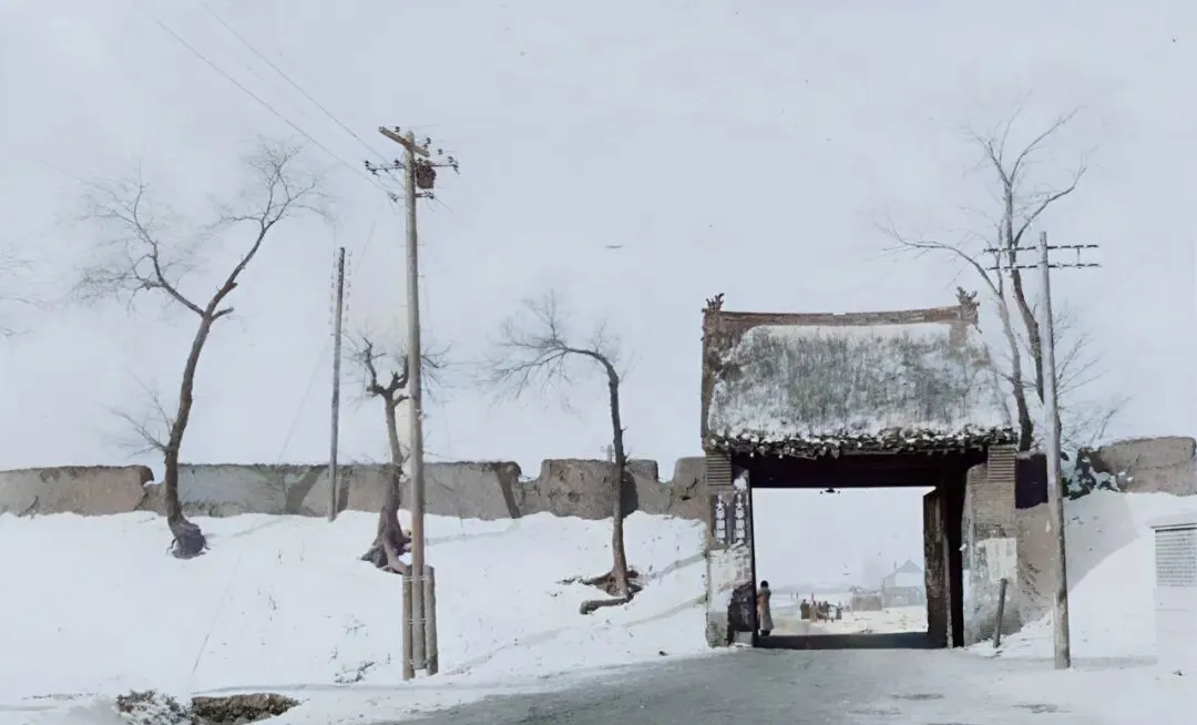 这条笔直的白墙就是当年的城垣,墙头一排女儿墙,像梳子齿一样整齐,电线杆沿着墙走,风一吹嗡嗡响,墙根堆着扫帚和柴把子,行人把衣襟裹得紧紧的从拱门边掠过去,冷得见风掉泪。