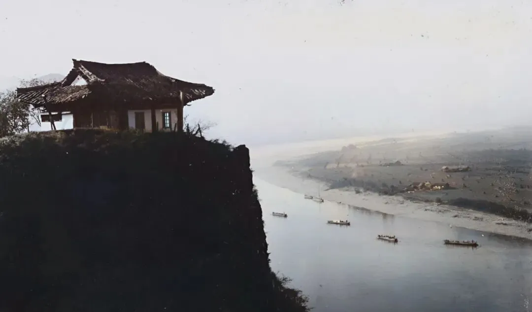 这处临江小亭叫洗剑亭,房子就悬在崖口上,江心木排一溜排开,点点人影在桨上用力,水面被切出一道道银光,奶奶说风大的时候桨会抖手,顺水也得攥紧了劲,不然一翻身就要落汤。